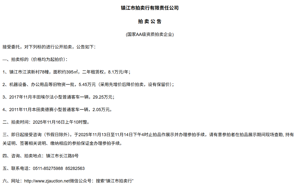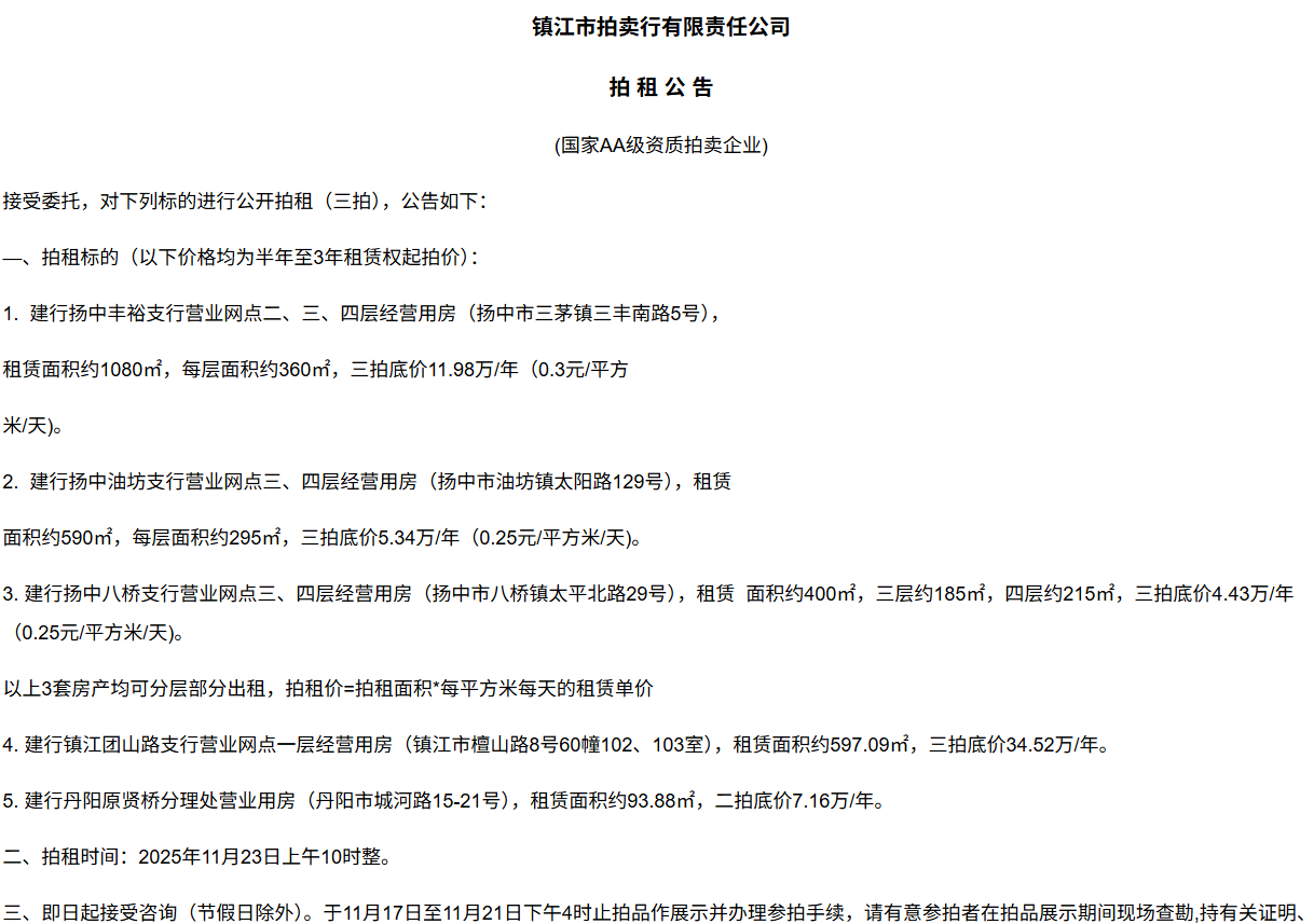 鎮江市拍賣行有限責任公司拍 租 公 吿(國家AA級資質拍賣企業)接受委托,對下列標的進行公開拍租(三拍),公告如下:—、拍租標的(以下價格均為半年至3年租賃權起拍價):1.  建行揚中豐裕支行營業網點二、三、四層經營用房(揚中市三茅鎮三豐南路5號),租賃面積約1080㎡,每層面積約360㎡,三拍底價11.98萬/年(0.3元/平方米/天)。2.  建行揚中油坊支行營業網點三、四層經營用房(揚中市油坊鎮太陽路129號),租賃面積約590㎡,每層面積約295㎡,三拍底價5.34萬/年(0.25元/平方米/天)。3. 建行揚中八橋支行營業網點三、四層經營用房(揚中市八橋鎮太平北路29號),租賃  面積約400㎡,三層約185㎡,四層約215㎡,三拍底價4.43萬/年(0.25元/平方米/天)。以上3套房產均可分層部分出租,拍租價=拍租面積*每平方米每天的租賃單價4. 建行鎮江團山路支行營業網點一層經營用房(鎮江市檀山路8號60幢102、103室),租賃面積約597.09㎡,三拍底價34.52萬/年。5. 建行丹陽原賢橋分理處營業用房(丹陽市城河路15-21號),租賃面積約93.88㎡,二拍底價7.16萬/年。二、拍租時間:2025年11月23日上午10時整。三、即日起接受咨詢(節假日除外)。于11月17日至11月21日下午4時止拍品作展示并辦理參拍手續,請有意參拍者在拍品展示期間現場查勘,持有關證明、簽署相關說明、繳納相應的參拍保證金辦理參拍手續。四、咨詢、拍租地點:鎮江市長江路9號五、聯系方式:0511-85275988   13655299933楊先生六、網址:http://www_zjauction_net.ccyingdi.cn;微信公眾號:搜索“鎮江市拍賣行” 拍品清單2025.11.23序號名稱起拍價(元)標的說明1建行揚中豐裕支行營業網點二、三、四層經營用房(揚中市三茅鎮三豐南路5號),租賃面積約1080㎡,每層面積約360㎡三拍底價11.98萬/年(0.3元/平方米/天)1、1-3號房產均可分層部分出租,拍租價=拍租面積*每平方米每天的租賃單價;2、意向競拍人在拍賣前需持營業執照或身份證與委托方說明租賃房產經營業態,確定意向后出具房產承租用途承諾書,經委托方審核后,方可交納保證金參加競拍;3、租賃期限為半年至3年(承租方與出租方協商而定),承租方每半年或一年結付租金,租賃期間的水、電費用及其它相關費用均由承租方承擔;4、承租方不得用于經營和保管危險物品,不得用于開設餐飲、娛樂等可能嚴重影響消防安全、運營安全的經營業態,不得用于經營委托貸款、小額貸款等可能冒用委托方名義,帶來聲譽風險的經營業態。租賃期內,承租方不得破壞墻體結構,自行成就消防、安全等使用條件,不得擅自將租賃房屋轉租、轉讓給他人使用,否則委托方有權收回房屋;5、拍租成交后,承租方將租金交至出租方指定賬戶,傭金交至拍賣方賬戶(拍租傭金為該房屋一個月租金)。承租方憑租賃合同無息退還保證金。2建行揚中油坊支行營業網點三、四層經營用房(揚中市油坊鎮太陽路129號),租賃面積約590㎡,每層面積約295㎡三拍底價5.34萬/年(0.25元/平方米/天)3建行揚中八橋支行營業網點三、四層經營用房(揚中市八橋鎮太平北路29號),租賃面積約490㎡,每層面積約245㎡三拍底價4.43萬/年(0.25元/平方米/天)4建行鎮江團山路支行營業網點一層經營用房(鎮江市檀山路8號60幢102、103室),建筑面積約597.09㎡三拍底價34.52萬/年5建行丹陽原賢橋分理處營業用房(丹陽市城河路15-21號),建筑面積約93.88㎡二拍底價7.16萬/年